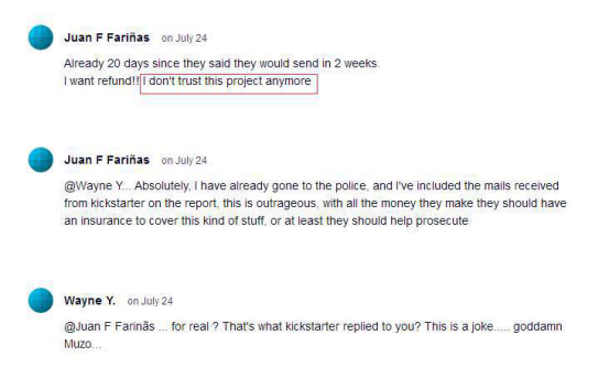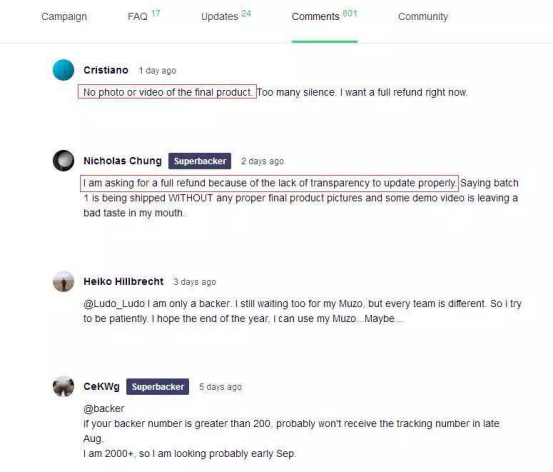 由于Muzo自公布了產(chǎn)品理念視頻后,就再也沒有相關(guān)產(chǎn)品的信息流出。一開始熱情高漲參與眾籌的朋友,既不了解產(chǎn)品的生產(chǎn)進(jìn)程,又查不到物流信息,紛紛對Muzo失去了信心和耐心。