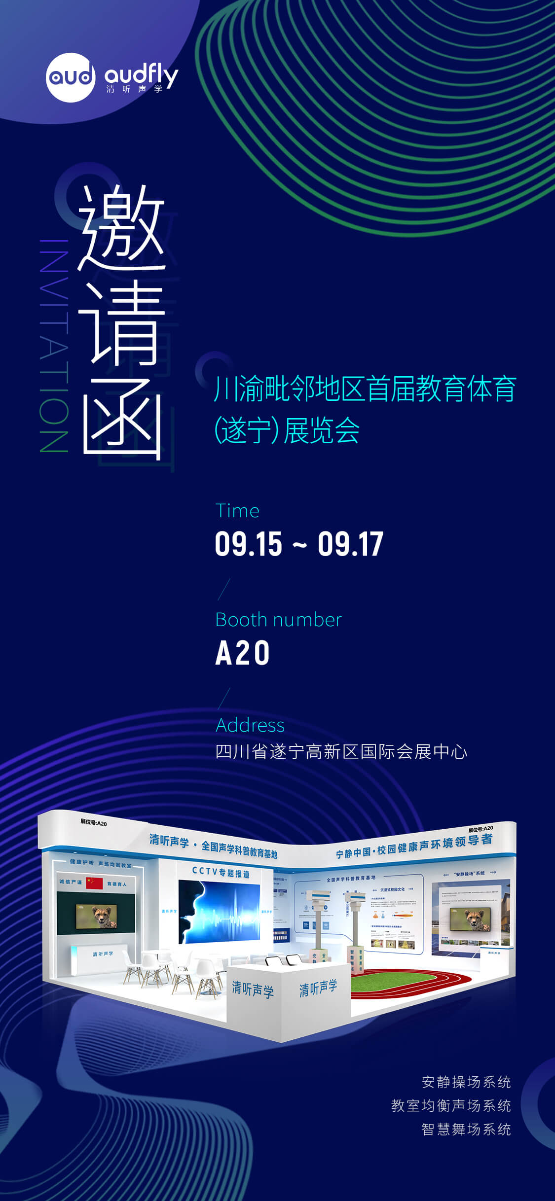 9月15日-9月17日,川渝毗鄰地區首屆教育體育(遂寧)展覽會將在四川省遂寧高新區國際會展中心舉辦,清聽聲學攜安靜操場系統、教室均衡聲場系統、智慧廣場舞系統參展,邀請您蒞臨現場,感受聲學科技的魅力!